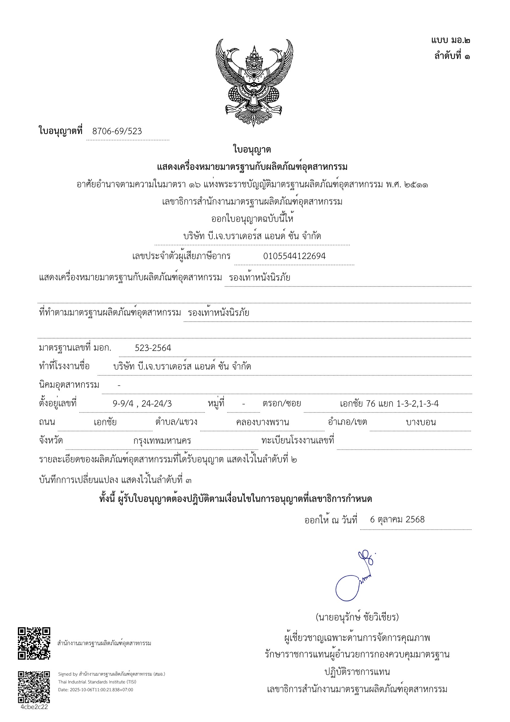 ใบอนุญาตเสื้อชูชีพกรมเจ้าท่า 1.01-67-007