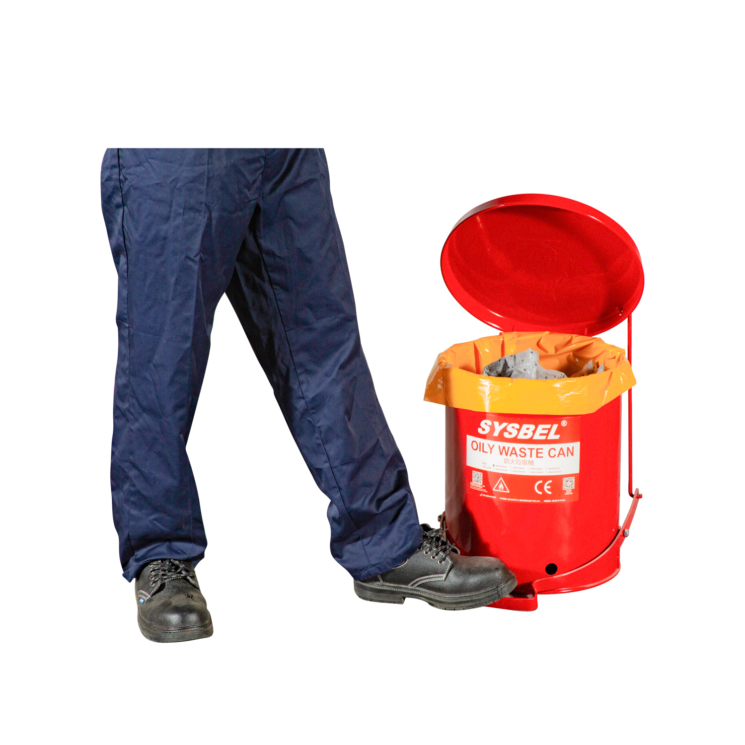ถังขยะปนเปื้อนน้ำมันตามมาตรฐาน OSHA ใช้เพื่อป้องกันความเสี่ยงจากอัคคีภัยและการเก็บรวบรวมเศษผ้าหรือวัสดุที่ชุ่มน้ำมัน (เช่น ตัวทำละลายไวไฟ, น้ำมันลินสีด และของเหลวไวไฟอื่นๆ)