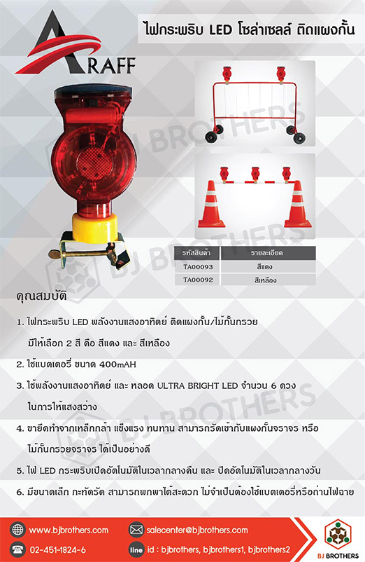 1. ไฟกระพริบ LED พลังงานแสงอาทิตย์ ติดแผงกั้น/ไม้กั้นกรวย มีให้เลือก 2 สี คือ สีแดง และ สีเหลือง