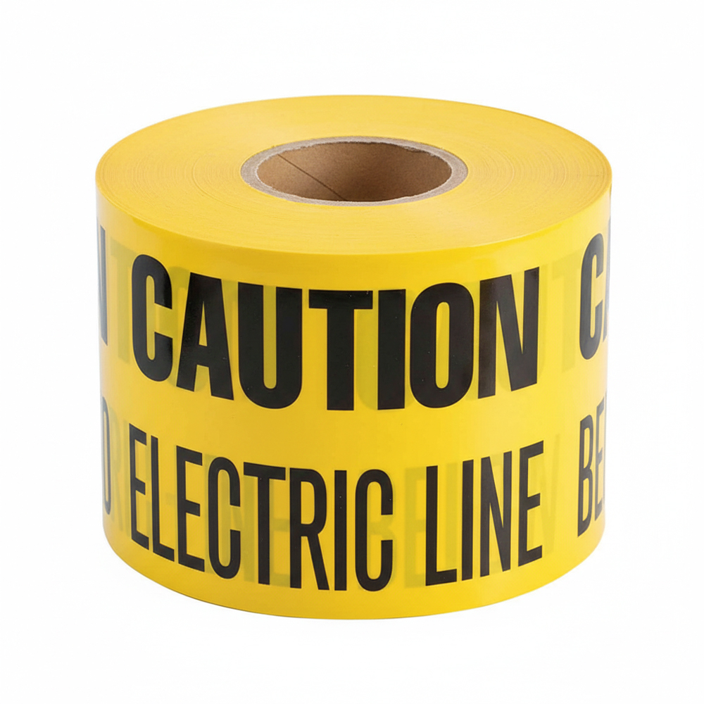 • High Visibility : สีสันสดใส (แดง/เหลือง) พร้อมข้อความ "CAUTION: ELECTRIC LINE BURIED BELOW" ตัวอักษรคมชัด อ่านง่าย