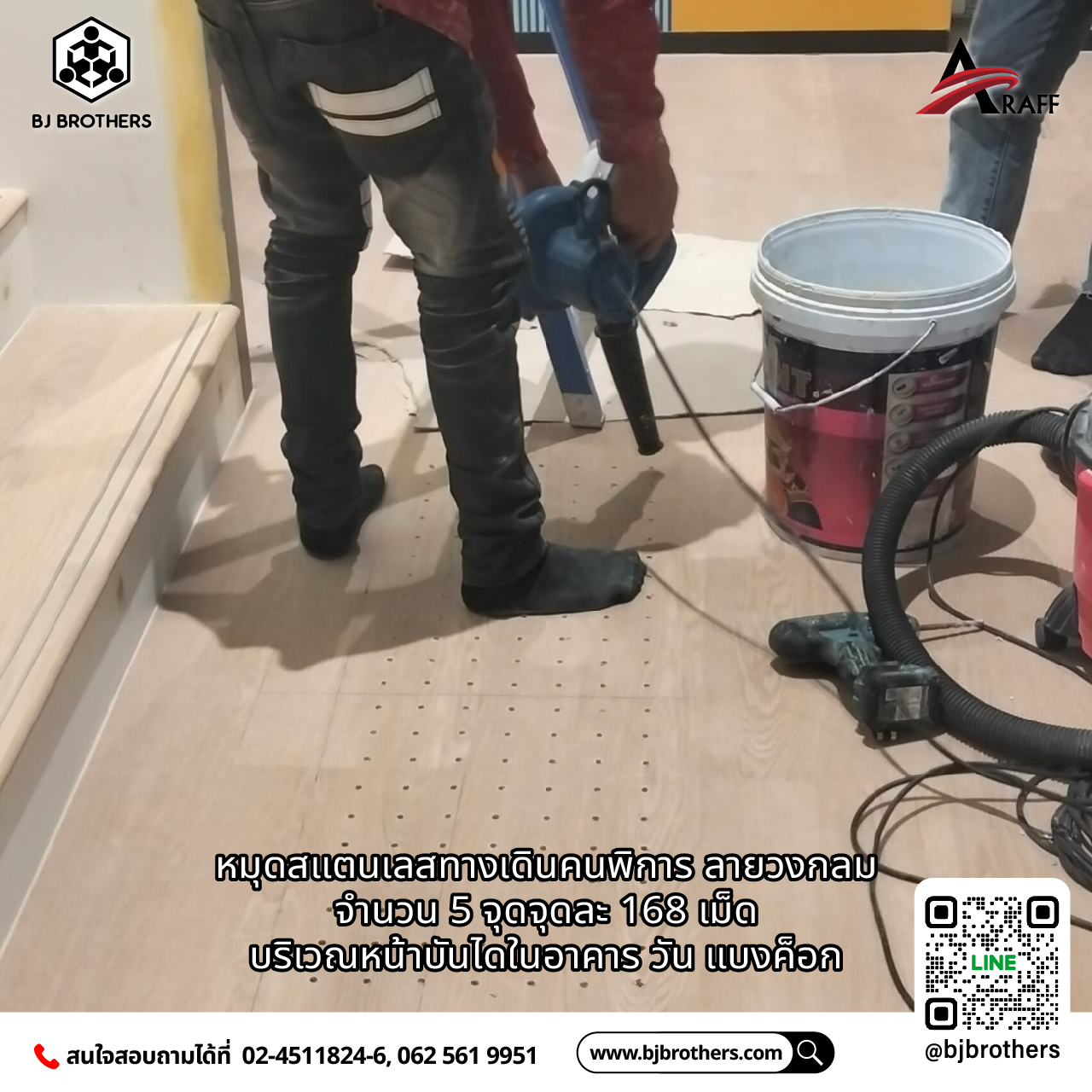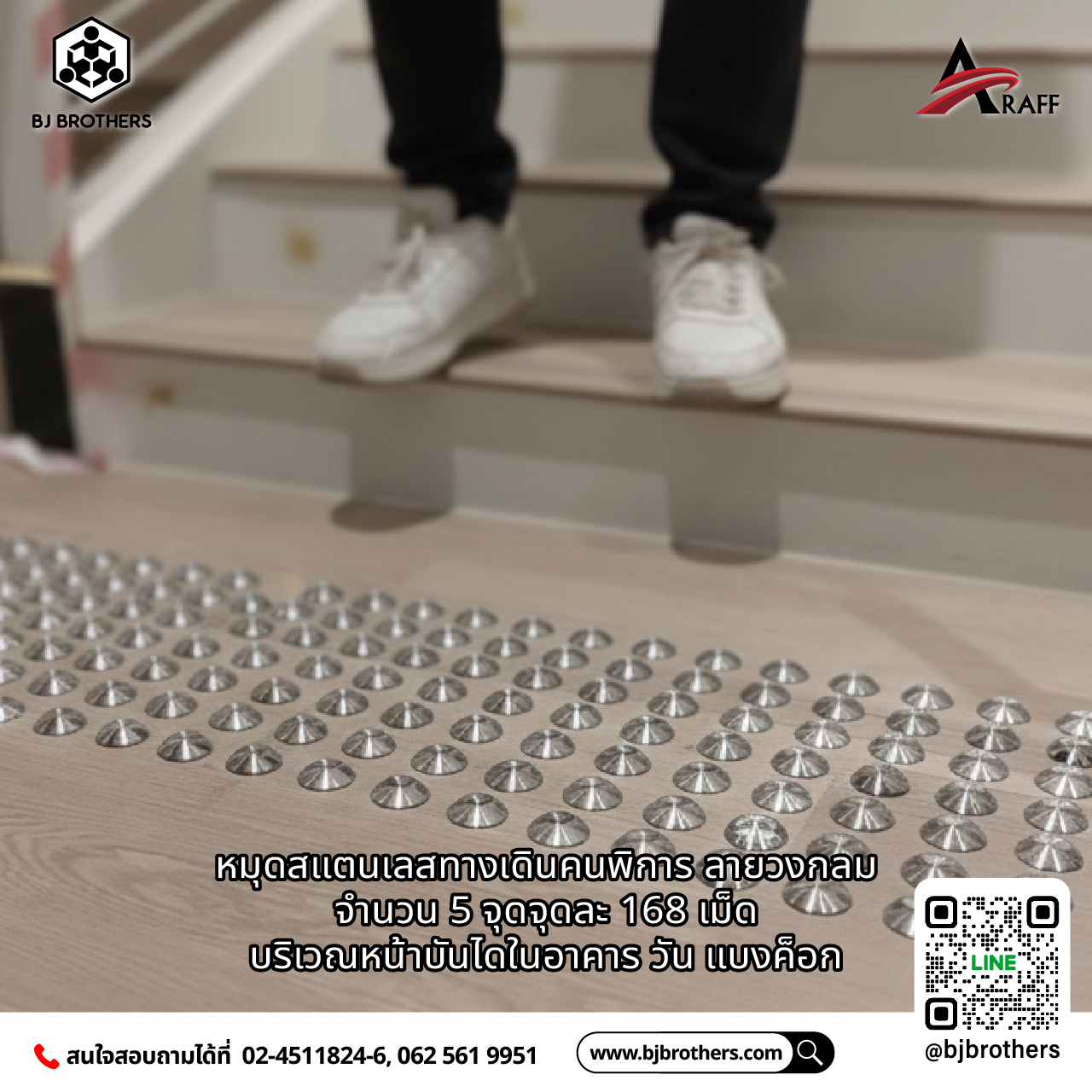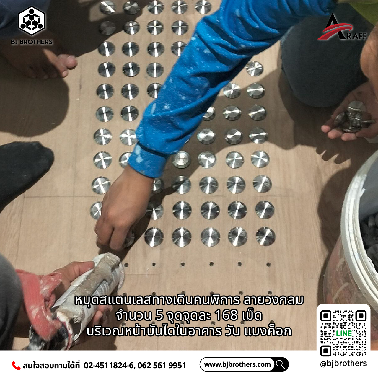โครงการติดตั้ง หมุดสแตนเลสทางเดินคนพิการ ลายวงกลม จำนวน 5 จุดจุดละ 168 เม็ด บริเวณหน้าบันไดในอาคาร วัน แบงค็อก จำนวน ที่ติด 1008 ตัว