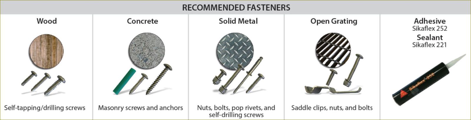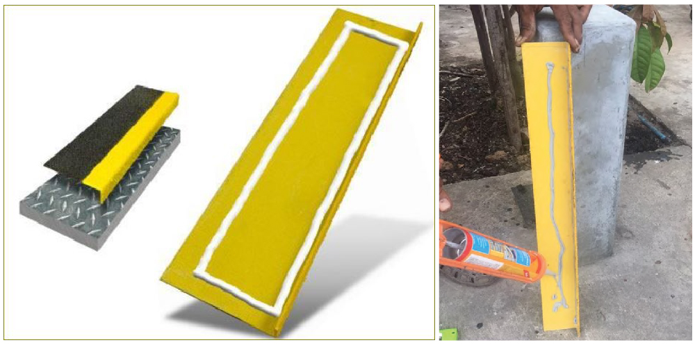 วิธีการติดตั้งแผ่นปูพื้นกันลื่นไฟเบอร์กล๊าส หรือแผ่นปิดจมูกขอบมุมคิ้วแผงครอบบันไดเหล็ก ขึ้นอยู่กับพื้นผิวว่าเป็นแผ่นขั้นบันไดเหล็ก แผ่นไม้ พลาสติค กระเบื้องเซรามิค หรือพื้นปูนคอนกรีต เป็นผิวแบบเรียบหรือขรุขระหรือมีช่องรู เช่น เป็นตะแกรงขั้นบันได โดยหากเป็นพื้นปูนหรือพื้นผิวเรียบ สามารถใช้กาวซิลิโคนติดตั้งได้ แต่หากเป็นขั้นบันไดโลหะหรือพื้นเป็นช่องรูตะแกรง สามารถเจาะแล้วยิงด้วยรีเว็ตหรือยึดสกรูน๊อตได้ โดยทั่วไปแล้ว สามารถเลือกวิธีการยึดแผ่นกันลื่นกับพื้นผิวหรือตะแกรงขั้นบันได ได้ดังนี้
